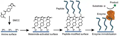 Many binding chemistries may be used to adhere an enzyme to a surface to varying degrees of success. The most successful covalent binding techniques include binding via glutaraldehyde to amino groups and N-hydroxysuccinide esters. These immobilization techniques occur at ambient temperatures in mild conditions, which have limited potential to modify the structure and function of the enzyme.[6]