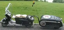 The result was the Campi trailer, which was styled to complement a scooter and was roomy enough to carry a set of 1960s camping equipment.[13] IWL made the Campi's chassis, including a tubular steel towing link that connected to the scooter behind the pillion seat and above the rear light.[12] Stoye made the bodywork, which is aluminium and contributes to the trailer weighing only 30 kg (66 lb).[12] This made it light enough for a Berlin's 7.5 bhp engine to cope with the combined weight of its rider, passenger, trailer and luggage, albeit at markedly less speed than when being ridden solo.[12]