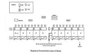 The core of these tactics was organizing soldiers into ranks and files in order to form a regiment into a line of battle or column.[21] The line was the primary formation of combat as it allowed the soldiers to fire a full volley at the enemy. Generally consisting of companies formed up into two ranks with files close enough to touch elbows, the line was held in alignment by placing the regimental colors in the center and a designated guide on either end of the line. File closers spread out just behind the line helped ensure order and prevented soldiers from deserting. Thus organized, a standard 475-man regiment occupied a front of 140 yards.[23] The column was primarily used for maneuvering, with a simple column consisting of companies stacked up behind one another at varying distances. More common was the double column consisting of two stacks of companies next to each other as doing so shortened the formation's length and widened its frontage. Infantry squares were rarely employed, both because they were the most difficult formation to carry out and because they were rarely necessary on Civil War battlefields.[24]