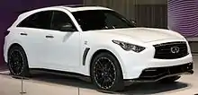 The Infiniti QX70, formerly called the Infiniti FX until 2013, is a compact luxury[2] crossover SUV produced by the Nissan-owned Infiniti luxury vehicle brand between 2002 and 2017. The FX replaced the QX4 as Infiniti's mid-size SUV. It shares the same FM platform as the rear-wheel drive Nissan 370Z, and it "made no claims of climbing mountains." Rather, its aggressive shape promised style and quick handling.[3] The similarly sized Nissan Murano is based on the same D platform as the front-wheel drive Nissan Altima. The FX does not have a Nissan-branded equivalent and is not sold in Japan.