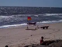 Prior to the start of a patrol, it is the driver's responsibility to ensure the craft is correctly set up and ready for patrolling duties. Typically this will involve inflating the crafts four pontoons to the correct pressure with a hand/foot or electric pump. The motor is test run in a tank of fresh water to check full function and reliability before installation to the transom. The fuel bladder is filled and installed along with a tow rope, rescue tube, two oars, and a blunt point knife as minimum. A check list is then filled in by the driver, after which the IRB may be signed on for patrol by radioing "Surf Command". At this point other patrol members assist to move the craft to a suitable launching position on the beach. The IRB is typically set up in a location outside the safe swimming area defined by the patrol flags. Where applicable, the boat may be towed onto the beach by way of a tractor or small jeep and trailer.