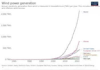 - ↑ "Wind power generation". Our World in Data. Retrieved 19 August 2022.