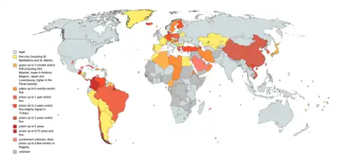 Insult is reserved to countries of civil law but a similar behavior in public can be considered public disorder in common law, especially in that of the United Kingdom[7] and former colonies of the British Empire after 1776.[8] The difference is that in civil law there is a personal target and the damaged legal good is their honor but in common law the public is targeted and the damaged legal good is the public order. The unlikeness persists also in public insults of civil law.