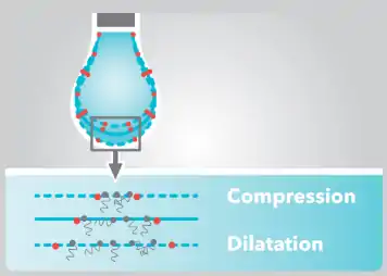 Most commonly, the measurement of dilational interfacial rheology is conducted with an optical tensiometer combined to a pulsating drop module. A pendant droplet with surface active molecules in it is formed and pulsated sinusoidally. The changes in the interfacial area causes changes in the molecular interactions which then changes the surface tension.[3] Typical measurements include performing a frequency sweep for the solution to study the kinetics of the surfactant.
