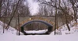 The Interlachen Bridge is a reinforced concrete arch bridge on William Berry Parkway between Bde Maka Ska and Lake Harriet in Minneapolis, Minnesota. The bridge crosses the Como-Harriet Streetcar Line, a heritage streetcar line operated by the Minnesota Streetcar Museum which follows the same right-of-way as the original Twin Cities Rapid Transit line of the same name. The bridge was designed by local builder William S. Hewett. The bridge is one of the most significant bridges in Minnesota because it is the earliest known extant concrete bridge with a documented construction date.[2] The bridge was listed on the National Register of Historic Places on November 6, 1989, as part of the Reinforced-Concrete Highway Bridges in Minnesota MPS.[3]