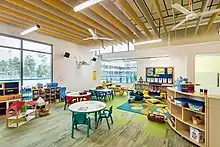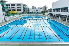 The Ampang campus, which began use from August 2018, is set on approximately 10 hectares (25.7 acres) in Ampang Hilir.[26] The campus has state-of-the-art facilities catering to both athletics and the arts. Athletic facilities include: an indoor fitness center, an Olympic-sized track; three sports fields; an Aquatic Complex including a 50-metre Olympic-sized swimming pool built accredited by FINA,[27] two gyms, an indoor climbing wall, tennis courts and playgrounds.[28][29] Arts facilities include The Dr. Norma J. Hudson Amphitheater, the Robert B. Gaw Theater and the Melawati Theater: available for student meetings, music recitals, presentations, plays and other arts-centric performances;[30][31] ISKL's ‘green’ facility is the first International school in Malaysia to achieve platinum Green Building Index (GBI) status with environmentally sustainable concepts.[32][33]