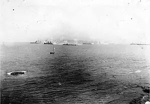 With the greatest threat to Canea appearing to come from the east, the International Squadron by 26 February had concentrated most of its ships in Suda Bay, east of Canea, where they could fire on insurgent forces holding the Akrotiri Peninsula. The squadron's men ashore also began patrols to keep the paved road between Canea and Suda open.[15] On 28 February 1897, insurgent forces mounted their first attack on the Ottoman-held blockhouse at Aptera on Malaxa Mountain overlooking Suda Bay; the blockhouse supported the Izzeddin Fortress, which in turn commanded the road. After receiving permission from the admirals of the International Squadron to shell the insurgents, the Ottoman Navy ironclad Mukaddeme-i Hayir fired three rounds, the first of which was particularly accurate, and her gunfire cleared the hillsides around the blockhouse of insurgents.[15][19]