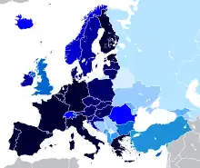 - ↑ Number of countries in Trade bloc: EU (27), EFTA (4), CEFTA (7), other regional blocs (not listed because countries inside are likely, sooner or later, to join EU, some already seriously involved in joining processes); EFTA countries and 4 European microstates marked x, while not EU members, are partially integrated in EU through euro currency, Schengen treaty, EU single market - EEA and Customs Union, see also;European Neighbourhood Policy, Eastern Partnership, Euromediterranean Partnership, Mediterranean Union, Transatlantic Free Trade Area, Eurosphere