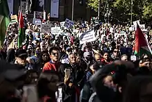 - Hundreds participated in additional protests in solidarity with Palestine in multiple countries worldwide, including major cities across the United States, Spain, Italy, Iran, Libya, Somalia, Bosnia and Herzegovina, South Africa, Australia, France, and Germany.[71] In the United States, notable demonstrations were held in New York City, Detroit,[72] Dallas,[73] Denver,[74] San Francisco, and San Diego.[75]