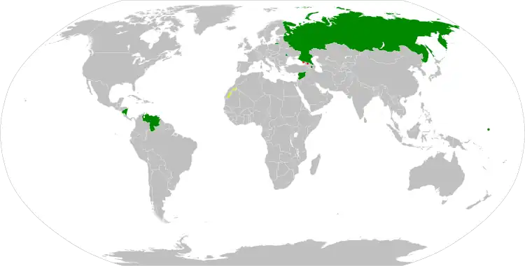 Abkhazia and South Ossetia have been initially recognised by seven UN member states, until Tuvalu withdrew its recognition of both in 2014,[1][2][3] while the status of Vanuatu's recognition of Abkhazia led to confusion between 2011 and 2015. Vanuatu reconfirmed in 2019 it does not support nor recognize the independence of Abkhazia, and supports Georgian territorial integrity including the two disputed territories.[4][5] Georgia has severed diplomatic relations with the states recognising Abkhazia and South Ossetia, with Syria in 2018 being the most recent example.[6] Abkhazia and South Ossetia recognise each other, and also have some recognition from non-UN member states.