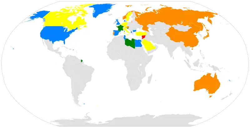 The Syrian National Council has asked for recognition within the international community, but it also denies that it seeks to play the role of a government-in-exile.[6] In 27 February 2012, the Syrian National Council is currently recognised or supported in some capacity by 17 UN member states, with three of those being permanent members of the Security Council, France,[7] the United States,[8] the United Kingdom,[9] Spain, Bulgaria, Tunisia, Egypt and also Libya's National Transitional Council,[10] who announced that it had been in talks with the Syrian National Council and is considering to give weapons, volunteer fighters and training via the National Liberation Army to the Free Syrian Army.[11] It has received support of the Turkish Prime Minister, Recep Tayyip Erdoğan.[12] The Foreign Ministers of seven UN member states, notably Russia and the People's Republic of China, have met with representatives of the council, but have not recognised or supported it officially in any capacity nor have they, excepting Australia and Austria, explicitly rejected the Assad government.