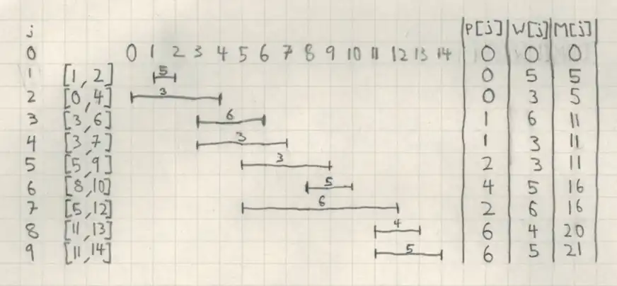 Here, we input our final vector (where j=9 in this example) into our schedule function from the code block above. We perform the actions in the table below until j is set to 0, at which point, we only include into our final schedule the encountered intervals which met the requirement. This final schedule is the schedule with the maximum weight.