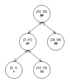 The key of each node is the interval itself, hence nodes are ordered first by low value and finally by high value, and the value of each node is the end point of the interval: