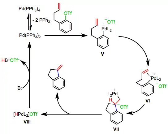 Most asymmetric Heck reactions employing chiral phosphines proceed by the cationic pathway, which does not require the dissociation of a phosphine ligand. Oxidative addition of an aryl perfluorosulfonate generates a cationic palladium aryl complex V. The mechanism then proceeds as in the neutral case, with the difference that an extra site of coordinative unsaturation exists on palladium throughout the process.