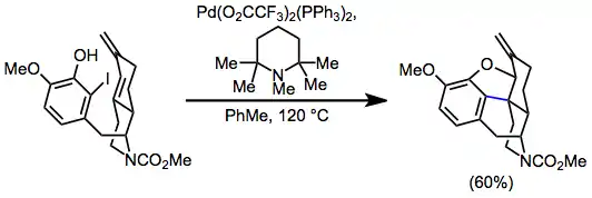 Tandem reactions initiated by IMHR have been extensively explored. Palladium alkyl intermediates generated after migratory insertion may undergo a second round of insertion in the presence of a second alkene (either intra- or intermolecular).[15] When dienes are involved in the intramolecular Heck reaction, insertion affords π-allylpalldium intermediates, which may be intercepted by nucleophiles. This idea was applied to a synthesis of (–)-morphine.[16]