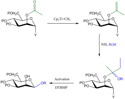In this method, the glycosyl donor is protected at the C-2 position by an OAc group. The C-2-OAc protecting group is transformed into an enol ether by the Tebbe reagent (Cp2Ti=CH2), and then the glycosyl acceptor is tethered to the enol ether under acid-catalysed conditions to generate a mixed acetal. In a subsequent step, the β-mannoside is formed upon activation of the anomeric leaving group (Y), followed by work up.[2]