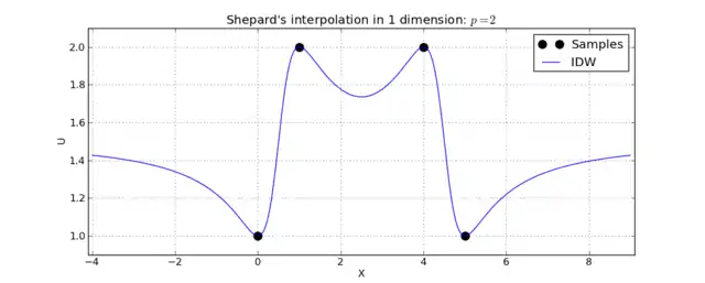 Shepard's interpolation in 1 dimension, from 4 scattered points and using p = 2
