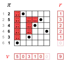 This article uses the term inversion vector () like Wolfram.[13] The remaining two vectors are sometimes called left and right inversion vector, but to avoid confusion with the inversion vector this article calls them left inversion count () and right inversion count (). Interpreted as a factorial number the left inversion count gives the permutations reverse colexicographic,[14] and the right inversion count gives the lexicographic index.