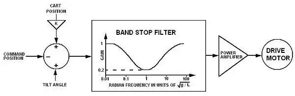 3. A normal pendulum subject to a moving pivot point such as a load lifted by a crane, has a peaked response at the pendulum radian frequency of . To prevent uncontrolled swinging, the frequency spectrum of the pivot motion should be suppressed near . The inverted pendulum requires the same suppression filter to achieve stability.