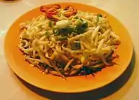• Sar Hor Fun (Chinese : 沙河粉) – Ipoh is famous for its flat rice noodles, which is prepared with local unfiltered spring water. There are two varieties: Kai see hor fun (Chinese : 鸡丝河粉) is served in a clear chicken and prawn soup with chicken shreds, prawns and spring onions. Chau hor fun (Chinese : 炒河粉) is fried with a little dark gravy, as opposed to Penang char kway teow (炒粿条) which has no gravy but is fried with egg, prawns and cockles. It is also different from Cantonese-style wat tan ho (滑蛋河) which is completely immersed in clear, egg-starch gravy.