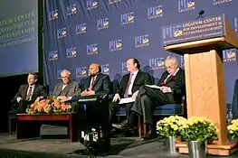 Five Nobel Laureates in Economics graced the inauguration of the Legatum Center in 2008. There was a panel discussion moderated by Quadir that involved four laureates. From left to right, Eric Maskin, Lawrence Klein, moderator Quadir, Robert Merton and Edmund Phelps.[4]