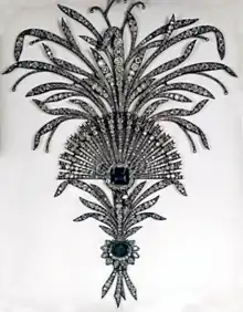 An elaborate diamond and emerald Aigrette, set in silver. Part of the Iranian Crown Jewels.