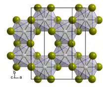 Iridium(III) bromide is a dark reddish-brown solid that is insoluble soluble in water, acids, and alkalis and decomposes to iridium(II) bromide on heating.[1] It crystallizes in a highly disordered layered structure of aluminum(III) chloride or chromium(III) chloride type, where the monoclinic unit cell contains four formula units. As with rhenium(III) chloride, rhenium(III) bromide, α-iridium(III) chloride and α-ruthenium(III) chloride, the disorder is due to the different stacking of the metal layers.[4] The light olive green tetrahydrate is slightly soluble in water but insoluble in ethanol and ether. When heated to 100 °C, it turns dark brown with release of water and decomposes to iridium and bromine at higher temperatures.[1] It reacts with germanium dibromide in hydrobromic acid solution to form a compound containing Ir-Ge bond, and adding Cs+ to it can separate Cs3[Ir(GeBr3)nBr6−n] (n=1, 2, 3).[5]