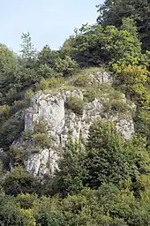The "Vorderkeilberg Quarry" is a now-filled Lias sandstone quarry located near the Große Doline Schauergrube and on another exposure near the Keilberg Church.[29] Is the second outcrop of the formation, located over Hettangian (Lias alpha I and II Quartzite) strata (with the index ammonites Psiloceras & Schlotheimia). The outcrops lack Sinemurian-Pliensbachian (With the exception of Spinatum Limestones on Vorderkeilberg).[29] The Epsilonkalksandstein here has a thickness of nearly 5 m and is composed mostly by Sandstone wit Limestone inserts. It underlies the Variabilis Limes and Cuaternary dull brown rich in mica, significantly stratified Loess.[29]