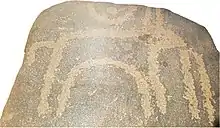 Radiocarbon dating artefacts found at Muweilah puts the settlement's original date of establishment at between 850 and 800 BC and it enjoyed a brief heyday before being destroyed in a fire around 600 BC.[15] Constructed in the main from interlocked mud bricks and mud/stone brick walls,[16] the walled settlement itself surrounds a large walled enclosure with seven buildings, thought to have provided living quarters as well as an administrative centre. This central building contained at least twenty columns and has been a rich trove for archaeologists, with extensive finds of painted and spouted vessels, iron weapons and hundreds of bronze pieces. Enabled by the domestication of the camel in the region, thought to have taken place around 1,000 BC, Muweilah's trade included the manufacture of copper goods, with "extensive casting spillage from the manufacture of copper items found throughout the site".[15] Muweilah is relatively unique in its early and extensive adoption of iron goods, thought to have been imported from Iran.[17] Hundreds of grinding stones indicate the consumption of both barley and wheat. Although now some 15 km inland today, it is thought that in its heyday, Muweilah would have been located on a khor or creek.[18]