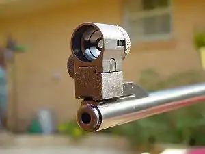 Target aperture sights are designed for maximum precision.[12] The rear sight element (often called "diopter") is usually a large disk (up to 1 inch or 2.5 cm in diameter) with a small hole in the middle, of approximately 1.2 mm (0.047 in) or less, and is placed close to the shooter's eye.[13] High end target diopters normally accept accessories like adjustable diopter aperture and optical filter systems to ensure optimal sighting conditions for match shooters. Typical modern target shooting diopters offer windage and elevation corrections in 2 mm (0.079 in) to 4 mm (0.157 in) increments at 100 m (109.4 yd). Some International Shooting Sport Federation (ISSF) (Olympic) shooting events require this precision level for sighting lines, since the final score of the top competitors last shots series is expressed in tenths of scoring ring points.