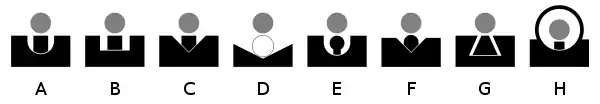 A selection of open sights, and one aperture sight suitable for use with long eye relief: A) U-notch and post, B) Patridge, C) V-notch and post, D) Express, E) U-notch and bead, F) V-notch and bead, G) trapezoid, H) ghost ring. The gray dot represents the target