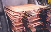 The Isa Process technology used the waxed edge at the bottom of the cathode plate to stop the copper depositing around the plate’s bottom to form a single mass of copper running from the top of one side of the cathode plate around the bottom to the top of the other side.[15] The copper was stripped from the cathode plates as two separate sheets.[15] The Kidd Process technology did not use wax, as it was thought that it could exacerbate the impurity problems with which the plant had been struggling. At Kidd, the stripping approach was to remove the copper from the cathode plate as a single “V”-shaped cathode product, akin to a taco shell.[15]