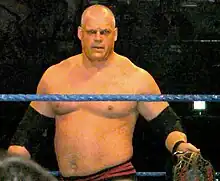 Kane then made an appearance on the October 16 episode of ECW as the hand-chosen partner of ECW Champion CM Punk, helping him defeat John Morrison, The Miz, and Big Daddy V in a three-on-two handicap match.[102] In retaliation, Big Daddy V attacked Kane on the October 19 episode of SmackDown!, igniting a feud between the two.[103] The two continued to battle in the following weeks.[104] Kane was voted to face the defending champion MVP for his United States Championship at Cyber Sunday, which Kane won by countout and thus did not win the title.[105] After this, he continued to feud with Big Daddy V, with the two ending up on opposite teams at Survivor Series, where Kane's team won.[106] Big Daddy V eventually began to team with Mark Henry, while Kane teamed with CM Punk. The feud concluded at Armageddon, where Kane and Punk lost to Big Daddy V and Henry after Big Daddy V pinned Punk.