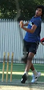 A right arm fast-medium bowler, the speed of Sharma's bowling has diminished since he emerged on the international scene,[59] although in 2008 he bowled a delivery at over 152 kilometres per hour (94 mph).[60] Such occurrences were not the norm as his pace dropped to around 130 km/h (81 mph), but under Eric Simons (who was India's bowling coach from 2010 to 2012) Sharma was regularly bowling in excess of 140 km/h (87 mph) when India toured Australia in 2011/12.[61][62] According to India's former bowling coach Venkatesh Prasad he is amongst the most dedicated bowler in India's set up.[63]