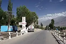 Ishkoshim (Tajik: Ишкошим), also Ishkashim (Russian: Ишкашим), is a village and a jamoat in south-east Tajikistan.[3] It is the seat of Ishkoshim District in Gorno-Badakhshan Autonomous Region. The jamoat has a total population of 7,673 (2015).[1] It lies on the river Panj, at the point where its direction turns sharply north. Ishkoshim lies opposite a town of the same name in Afghanistan, although the name of the Afghan town is normally transliterated Ishkashim. A bridge opened in 2006 links the two towns.[4] There are plans to reconstruct the 100-km highway connecting Ishkoshim to the regional capital Khorugh, which has been damaged by snow avalanches.[5]