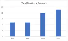 It is estimated that there are about half a million Muslims in Oceania, equating to about 1.4% of the total population of the continent.[12] Within the Asia-Pacific Muslim population, it is estimated that about 12-15% of adherents are Shia, the majority instead adhering to the Sunni denomination of Islam.[16] The islands are dominated by the Christian faith, with 98.3% of the population being Christian adherents.[12] However, it is estimated that 0.03% of the American Samoan population are Muslim adherents, the population almost doubling between the years 1990 to 2020 from 12 to 23 adherents.[12]
