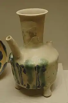 The shapes sometimes make it possible to distinguish the periods. This is the case for the jugs and pitchers, the most important group preserved: the first are placed in the lineage of the Sassanid forms (pear-shaped, slender body, narrow neck marked at the base by a projection, etc.); they disappeared in the 8th century in favor of a type of pear-shaped pitcher, the surface of which was treated in a new way, with veins made by applying a wet cloth or hands before cooking.[7]