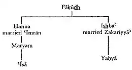 The Quran calls Mary "the daughter of Imran"[8] and it mentions that people called her a "sister of Aaron (Harun)".[9] Her mother, mentioned in the Quran only as the wife of Imran, prayed for a child and eventually conceived.[10] According to al-Tabari, Mary's mother was named Hannah (Arabic: هنا), and Imran (Arabic: عمران), her husband, died before the child was born.[11] Expecting the child to be male, Hannah vowed to dedicate him to isolation and service in the Temple.[10] However, Hannah bore a daughter instead, and named her Maryam.[12][13][14]