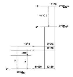 The direct production of 270Ds has clearly identified two nuclear isomers. The ground state decays by alpha emission into the ground state of 266Hs by emitting an alpha particle with energy 11.03 MeV and has a half-life of 0.10 ms. The metastable state decays by alpha emission, emitting alpha particles with energies of 12.15, 11.15, and 10.95 MeV, and has a half-life of 6 ms. When the metastable state emits an alpha particle of energy 12.15 MeV, it decays into the ground state of 266Hs, indicating that it has 1.12 MeV of excess energy.[22]
