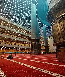 The main floor and the four levels of balconies make five floors in all; the number "5" represents the Five Pillars of Islam, within symbolizes the five daily prayers, and also of the Pancasila[25] Staircases at the corners of the building give access to all floors. The main hall is reached through an entrance covered by a dome 8 meters in diameter; the number 8 symbolizes August, the month of Indonesian Independence. The interior design is minimalist, simple and clean-cut, with a minimum of stainless steel geometric ornaments. The 12 columns are covered with stainless steel. On the main wall on qibla there is a mihrab and minbar in the center. On the main wall, there is a large metalwork in Arabic calligraphy, spelling the name of Allah on the right side and Muhammad on the left side, and also calligraphy of Surah Thaha 14th verse in the center. The metalworks, stainless steel covers and ornaments were imported from Germany. Originally, as in the National Monument nearby, the white marbles were planned to be imported from Italy. However to cut costs and support the local marble industry, it was later decided that the marbles would be from Tulungagung marble quarries in East Java instead.[26]