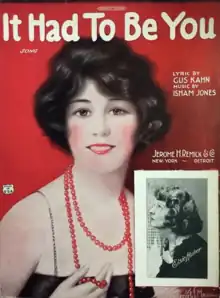 "It Had to Be You" is a popular song composed by Isham Jones, with lyrics by Gus Kahn.[5] It was published on May 9, 1924 by Jerome H. Remick & Co. of New York. Isham Jones Orchestra recorded an instrumental version of it on April 24, 1924 at Brunswick Studios, 799 Seventh Avenue, New York City,[4] and it was released in July. By early August, it was the number 1 record in the United States, where it remained for five weeks, finishing as the number 4 single of the year 1924.[6]