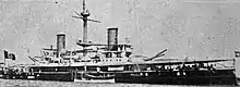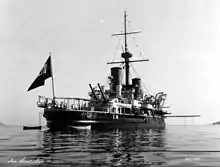 The ship spent the first several years of her career in the 1st Squadron, along with her sister Emanuele Filiberto, the three Re Umberto-class ironclads, and the two Regina Margherita-class battleships. In 1902–1903, Ammiraglio di Saint Bon was in the main Italian fleet with the three Re Umbertos and two of the Ruggiero di Lauria-class ironclads; while in their normal peacetime training routine, the ships of the main fleet were kept in commission for exercises for seven months of the year. For the remaining five months, they were kept in a partial state of readiness with reduced crews.[3] In October 1906, Ammiraglio di Saint Bon participated in major fleet maneuvers under the command of Vice Admiral Alfonso di Brochetti in the Ionian Sea. The exercises lasted from 10 to 26 October. The maneuvers culminated in a mock attack by the Italian fleet on the harbor defenses at Taranto.[4] During the 1908 maneuvers, Ammiraglio di Saint Bon served in the hostile squadron, tasked with attacking the friendly squadron, where her sister was assigned.[5]