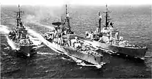 Decommissioned in 1953, Giuseppe Garibaldi was converted between 1957 and 1961, at the La Spezia shipyards, into a guided missile cruiser.