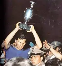 Tardelli's screaming celebration after his goal was one of the defining images of Italy's 1982 World Cup triumph.[28] Paolo Rossi won the Golden Boot with six goals as well as the Golden Ball Award for the best player of the tournament,[29] and 40-year-old captain-goalkeeper Dino Zoff became the oldest player to win the World Cup.[30] However, Italy failed to qualify for the 1984 European Championship.[31][32] Italy then entered as reigning champions in the 1986 World Cup[33][34][35] but were eliminated by reigning European Champions, France, in the round of 16.[36]
