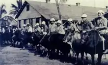 Wettengel served as Naval Governor of Guam from July 7, 1920 to February 27, 1921.[13] He overturned many of the policies of William Gilmer, the widely criticized and dislike governor immediately prior to him.[14] During his tenure, the Navy opened the first naval aviation station on the island at Orote Peninsula.[15] He attempted a military experiment during his time in office by forming the Guam Cavalry. These units rode mounted bulls but the idea was abandoned when the bulls proved untrainable.[16] He endorsed increasing medical aid to the island in an effort to in improving the "civilizing and Americanization" of the Chamorro people by making health care and sanitation more widespread.[17]