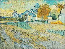 Van Gogh worked on a group of paintings The Wheat Field based on the field of wheat enclosed by a wall that he could see from his cell at Saint-Paul Hospital. Beyond the field were the mountains from Arles. During his stay at the asylum he made about twelve paintings of the view of the enclosed wheat field and distant mountains.[48] In May Van Gogh wrote to Theo, "Through the iron-barred window I see a square field of wheat in an enclosure, a perspective like Van Goyen, above which I see the morning sun rising in all its glory."[49] The stone wall, like a picture frame, helped to display the changing colors of the wheat field.[50]