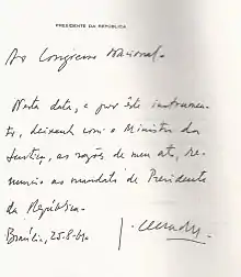 In the summer of 1961, Quadros faced increasing opposition from Congress and had alienated many former allies. On August 25, 1961, he unexpectedly resigned, citing foreign and "terrible occult forces" in his cryptic resignation letter. It is commonly believed that his resignation was a move to increase his power and that Quadros expected to return to the presidency by the acclamation of the people or by the request of the National Congress of Brazil and the military. Based on Goulart's unpopularity with the military and other conservative elements, he likely expected that his resignation would not be accepted.[22] However, that maneuver was immediately rejected by the National Congress of Brazil, which accepted Quadros's resignation and called on the president of the Chamber of Deputies of Brazil, Pascoal Ranieri Mazzilli, to take office until the vice president, João Goulart, could come back from his trip to China. Quadros's resignation created a serious political crisis, setting the stage for the 1964 coup. The military, which feared Goulart's leftist tendencies, seemed poised to oppose his inauguration by force. The United States was also concerned about the prospect of a Goulart presidency and considered supporting anti-Goulart forces.[23] Goulart finally took the oath as president on September 7, 1961, but his power was restricted by an amendment to the constitution passed on September 2 that created a parliamentary system of government. Goulart was not of the same party as Quadros because, at that time, Brazilians could split their vote for president and vice president from different parties.
