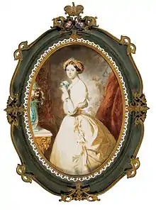 On 26 September 1860, after the death of his father Miloš Obrenović, he once again assumed power as the ruler of Serbia, making Julia, the Princess consort. She was not popular with the Serbs as they mistrusted her Catholic religion and Hungarian background.[2] Prince Mihailo was not a faithful husband, and he had at least one illegitimate son. His last mistress was Katarina Konstantinović, the young, pretty daughter of his first cousin, Princess Anka Obrenović, both of whom resided at the royal court at Mihailo's request. Katarina had even entertained hopes of eventually becoming Mihailo's wife on account of Julia's inability to bear the Prince a child, and Mihailo was considering a divorce in spite of the national outrage such a move would invariably cause.[2] In 1867, the esteemed Prime Minister Ilija Garasanin was dismissed from his post for having voiced his opposition to Mihailo's proposed divorce and marriage to Katarina. Katarina openly despised Princess Júlia and made her life miserable by flaunting her affair with Mihailo.[3] Júlia retaliated by conducting her own love affair with Duke Karl von Arenberg (1831-1896).[3] Duke Karl was a younger son of Prosper Louis, 7th Duke of Arenberg and a second cousin once removed of the Empress Sissi.[4]