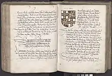 The Jüngere Hochmeisterchronik, Croniken van der Duytscher Oirden, or Utrecht Chronicle of the Teutonic Order is a Middle Dutch chronicle of the Teutonic Order.[1] It was written in or around the city of Utrecht in the Low Countries in several phases: around 1480, around 1491, and with some minor alterations after 1492 (possibly around 1496).[2] It has been referred to as “the final piece of the puzzle that is the official historiographic tradition of the Teutonic Order”.[3] The anonymous chronicle was likely authored by the land commander of the Utrecht bailiwick of the Teutonic Order, Johan van Drongelen, in cooperation with his personal secretary Hendrik Gerardsz. van Vianen.[4]