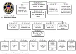 | Staff organization | The Joint Staff (for the chairman and the vice chairman; the service chiefs and the National Guard Bureau chief have their own staffs assisting them) |